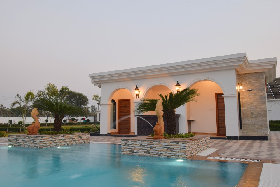 tranquil ambianceThe swimming pool at Umaid Farm Resort is a serene oasis designed to offer relaxation and luxury amidst nature. Set against a backdrop of lush green lawns, the pool features a unique and elegant shape, surrounded by a meticulously maintained tiled deck. The sparkling turquoise waters invite you to take a refreshing dip while enjoying the tranquil ambiance. Palm trees and manicured bushes add a tropical charm, making the pool area perfect for unwinding or soaking up the sun. Elegant seating arrangements and shaded spaces provide comfort for lounging or enjoying poolside refreshments. Whether you’re swimming laps, relaxing by the water, or hosting a private event, the pool at Umaid Farm Resort promises a rejuvenating and picturesque experience.
